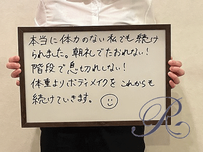 結果の一部 4ヶ月で 【体重−10.6s】 【体内年齢−10歳】 現在もまだまだトレーニング継続中!!の生徒さんです。 ![]() ■その他の お客様の結果 最下部に掲載してます |